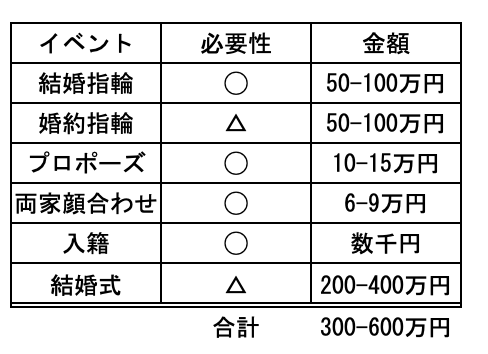 そこで今回は俺の実体験を交えながら、結婚までに必要なイベントとそれぞれの概算費用をまとめました。